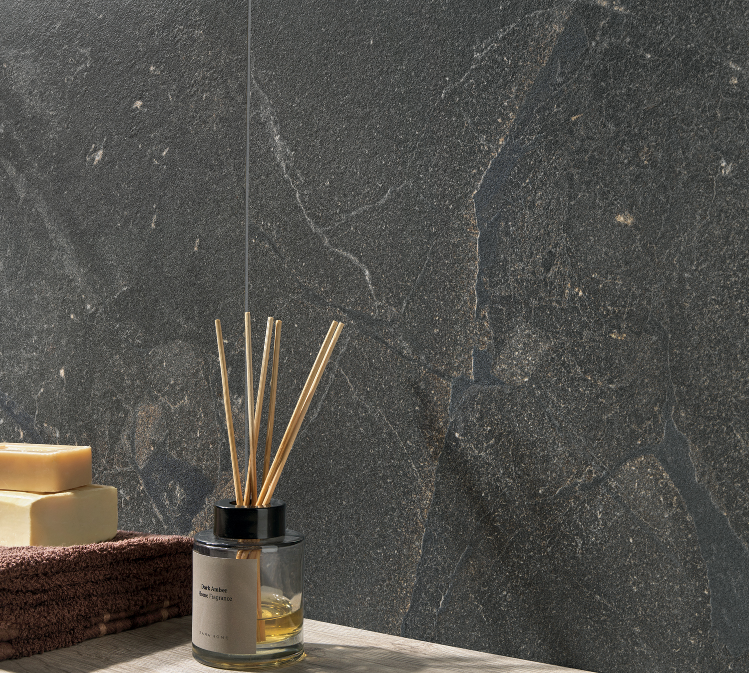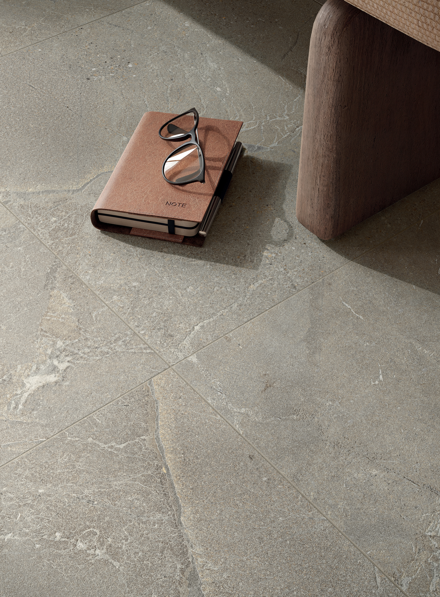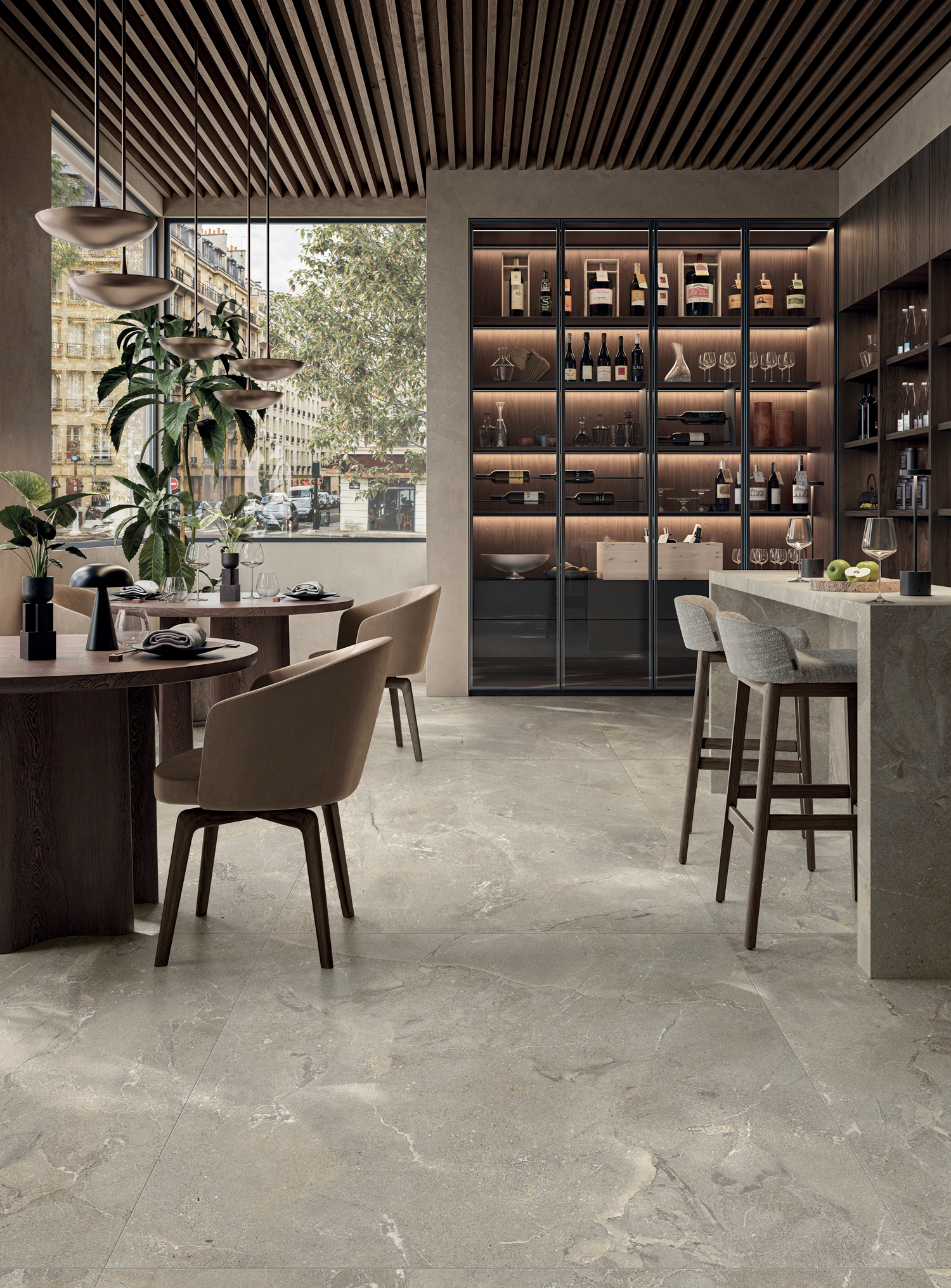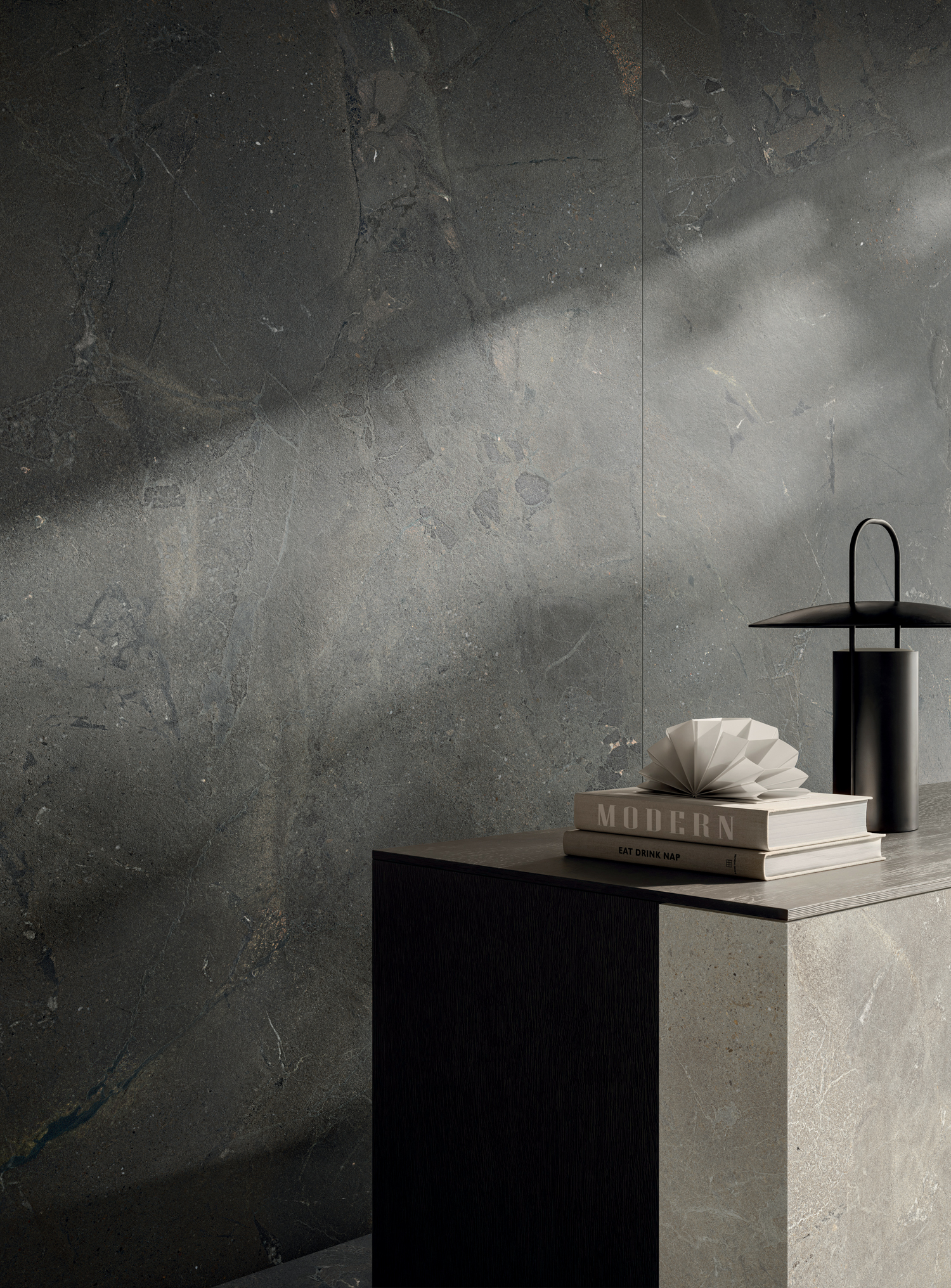 Les grands formats — dalles 120x278 cm et grès cérame 120x120 cm — amplifient la richesse du mouvement graphique et des détails de la matière, mettant en valeur l’unicité du sujet avec une continuité visuelle parfaite.