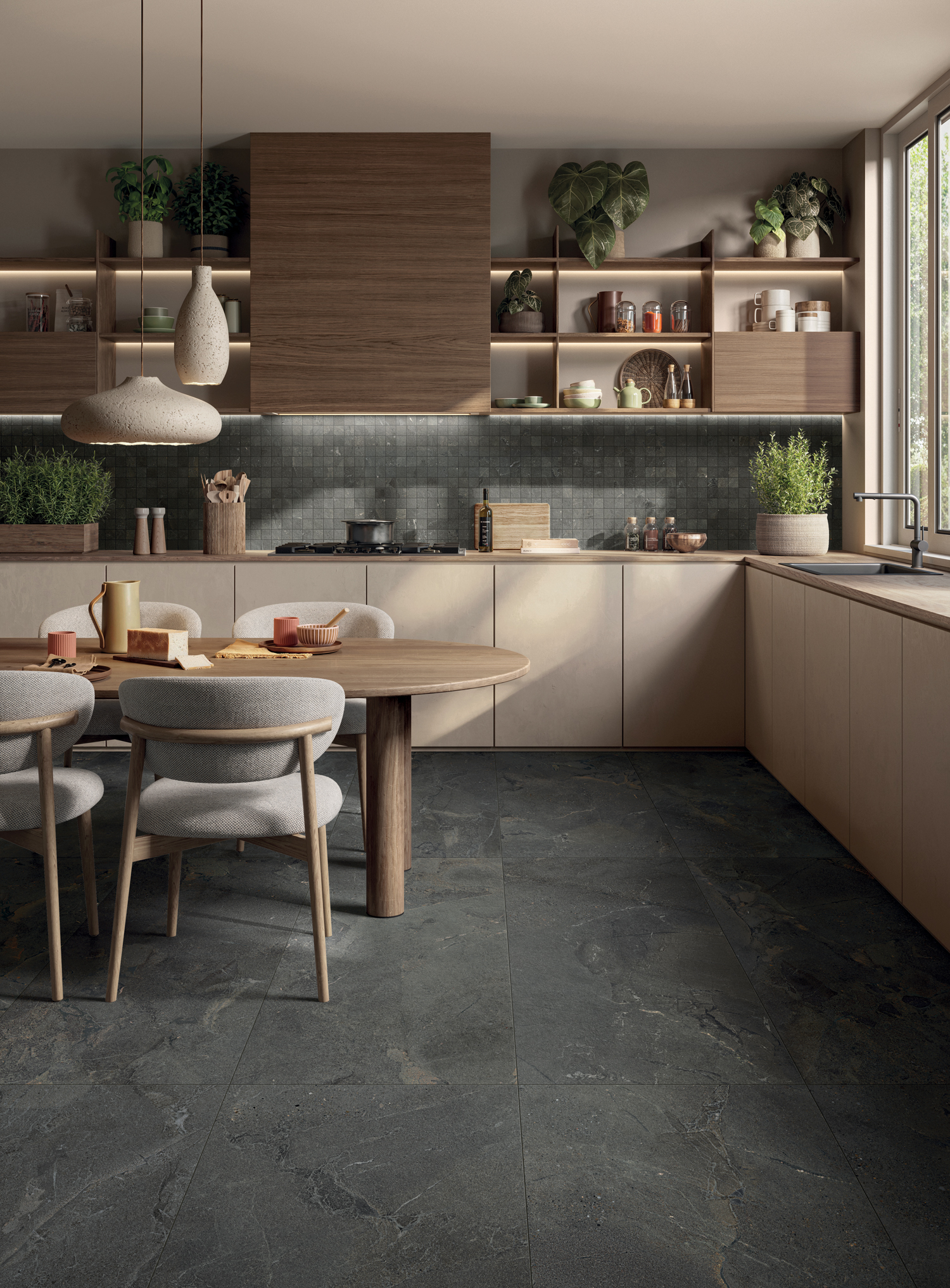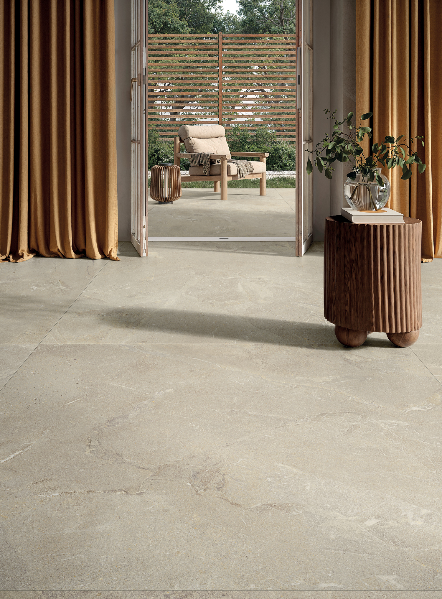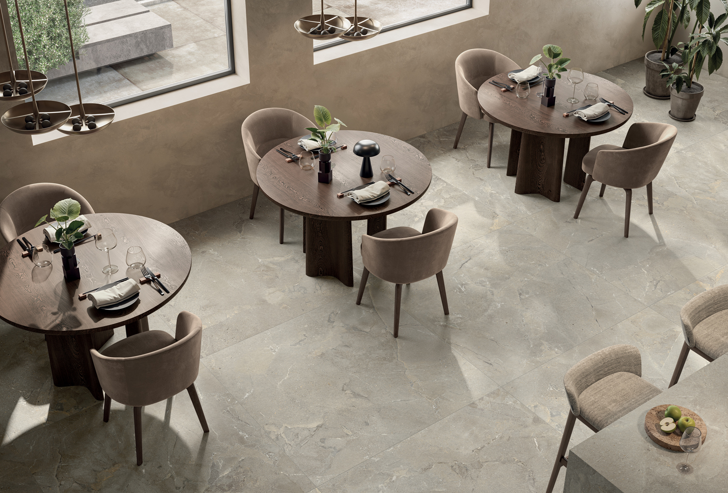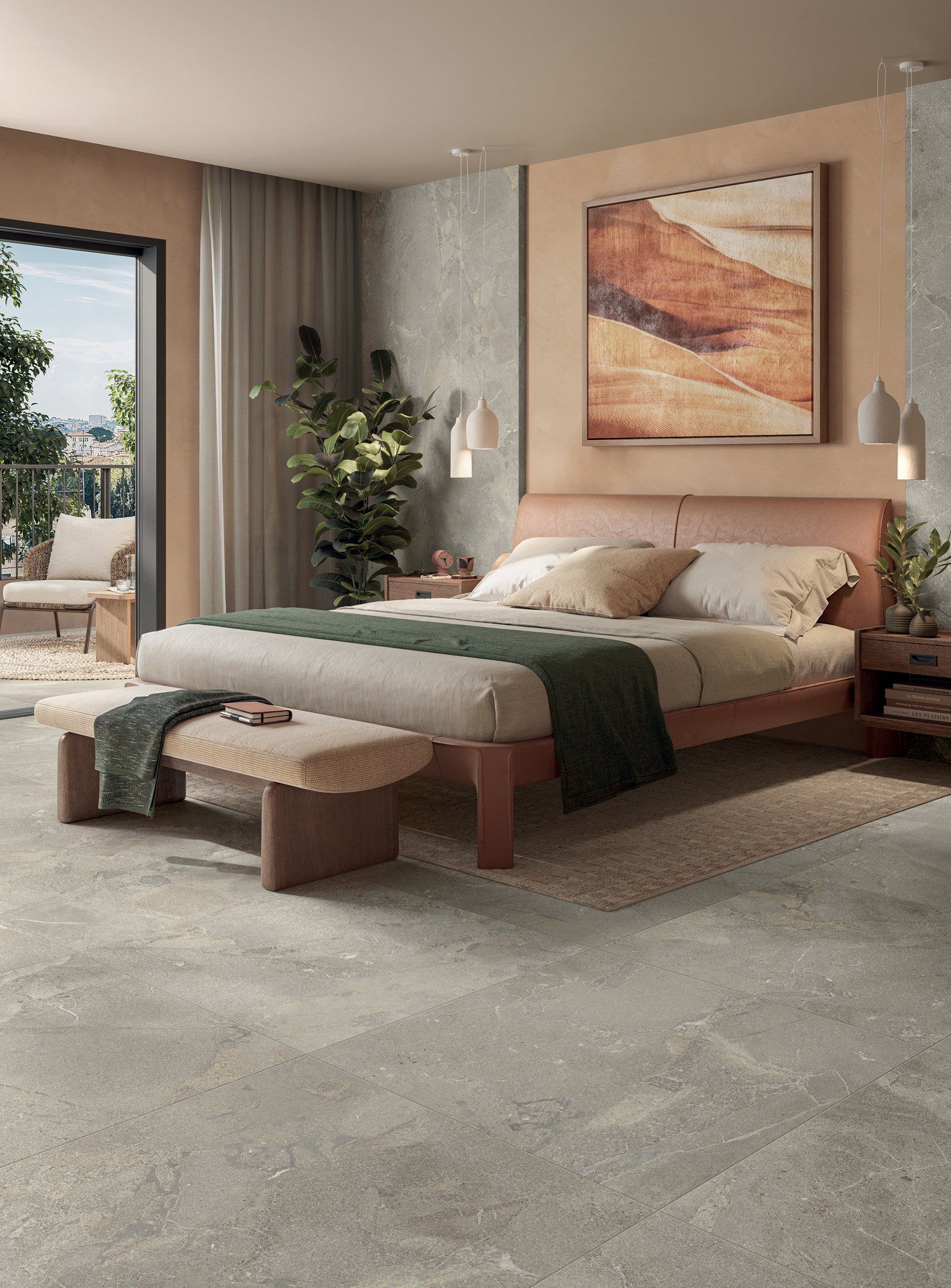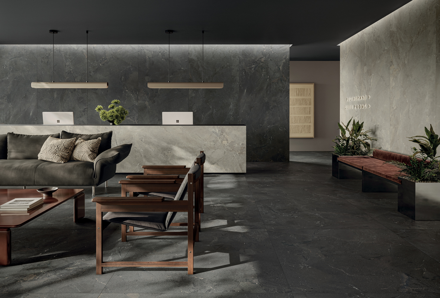 Les grands formats — dalles 120x278 cm et grès cérame 120x120 cm — amplifient la richesse du mouvement graphique et des détails de la matière, mettant en valeur l’unicité du sujet avec une continuité visuelle parfaite.