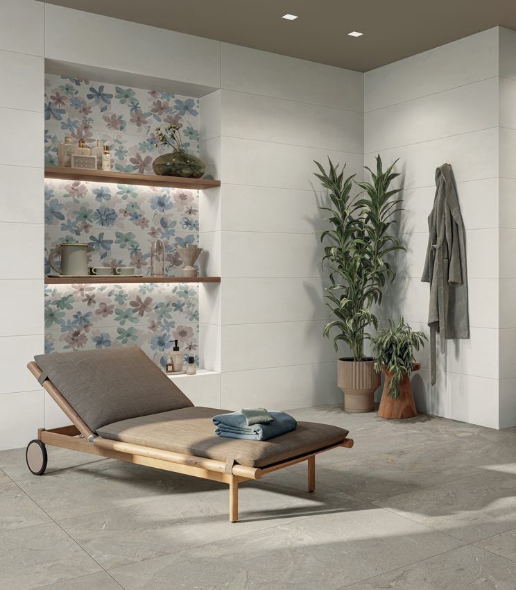 Dans la salle de bains, Cloud Dancer exprime sa dimension la plus intime. Les carreaux de salle de bains dans des teintes claires amplifient la lumière et transforment l'espace en un environnement relaxant et accueillant.