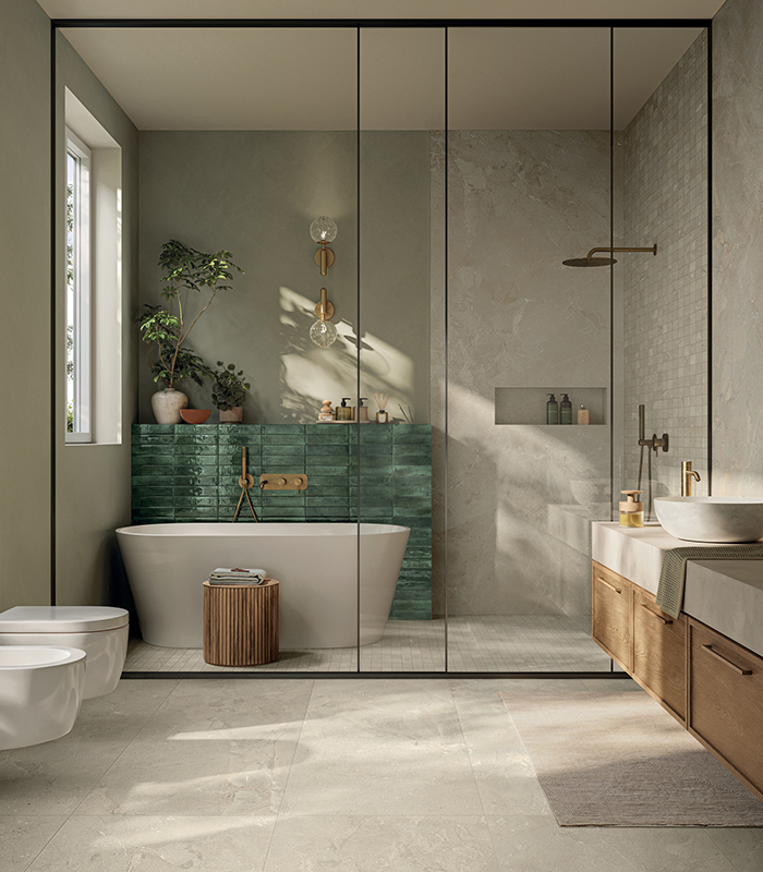 Outre la variété des compléments d’ameublement, des objets, des fournitures et des textiles, le choix des revêtements des sols et des murs permet sans aucun doute de donner à l’atmosphère générale une empreinte importante. En ce sens, le grès cérame est une solution plus efficace que d’autres, grâce à ses caractéristiques intrinsèques et à sa polyvalence, en matière de styles et d’effets. Un sol en grès effet bois combiné à un revêtement mural effet marbre crée un contraste élégant et raffiné. Le choix d’un grès effet ciment permet aussi de créer un style industriel et contemporain que l’on peut rendre plus riche et chaleureux en y ajoutant des détails en bois. La polyvalence de ce matériau permet de créer des combinaisons uniques et personnalisées qui s’adaptent aussi bien aux habitations traditionnelles qu’aux plus contemporaines.
