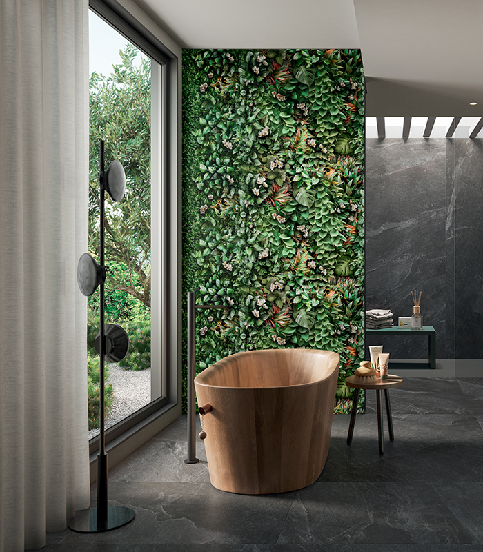 Voilà donc que s'intègrent, comme des compléments d'ameublement, des matériaux et des surfaces qui évoquent fortement la nature. La végétation entre dans la maison, exubérante et extravagante, avec des motifs floraux surdimensionnés, une profusion d'évocations et de dégradés de couleur, jamais excessifs. Ou avec des évocations à des éléments plus matériques en mesure de rendre l'atmosphère chaleureuse et agréable.