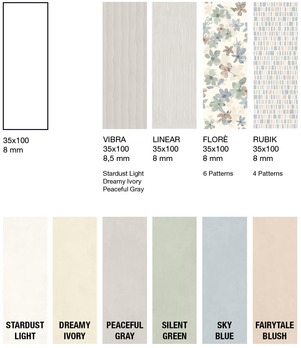 Six tons pastel – Stardust Light, Dreamy Ivory, Peaceful Gray, Fairytale Blush, Silent Green et Sky Blue – composent la palette de la collection. Ce sont des nuances raffinées et atténuées, capables d’alléger l’espace et d’y apporter une luminosité discrète, habillant les murs avec naturel et fluidité.