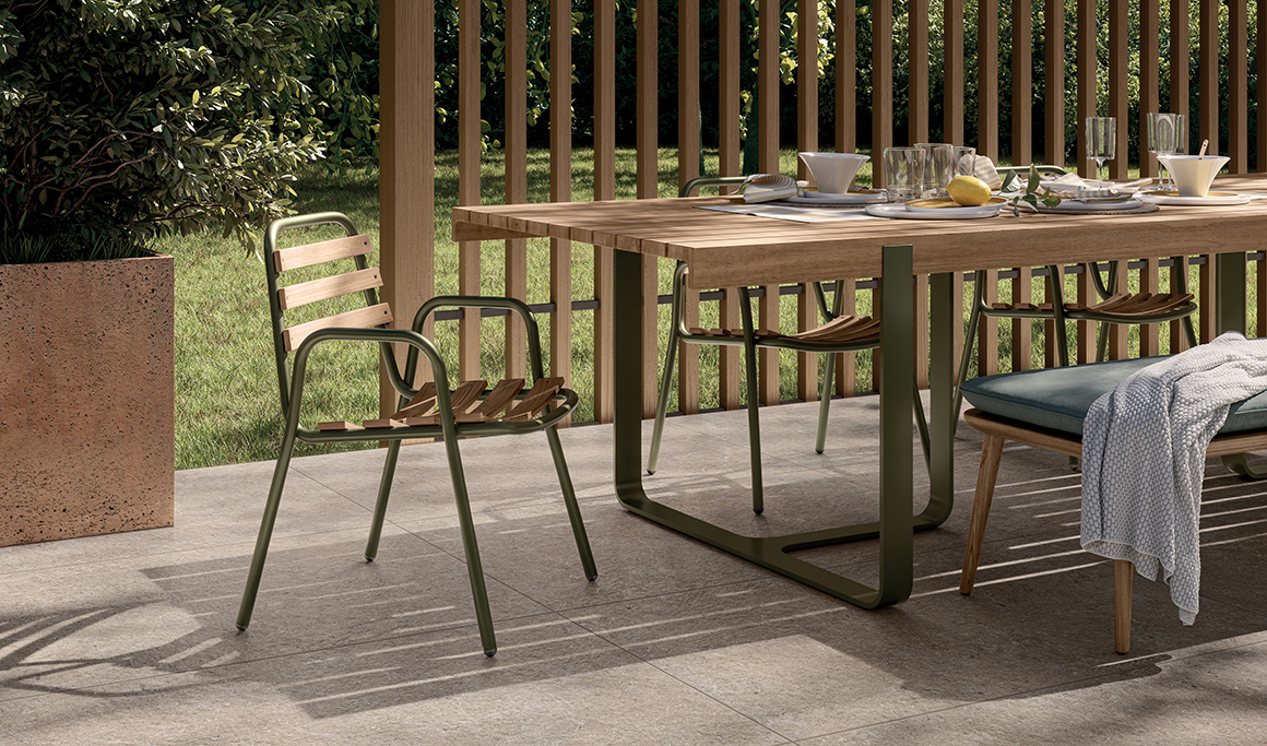 Les environnements domestiques situés à l’extérieur de l’habitation ne doivent pas forcément être considérés comme des espaces n’ayant rien à voir avec le reste de la maison. Pour cette raison, nous recommandons toujours d’appliquer une continuité de style entre l’intérieur et l’extérieur. Si les matériaux employés pour les revêtements externes sont adaptés pour les balcons, les terrasses, les portiques et les allées de jardins, il est important de choisir un revêtement qui soit en harmonie avec les environnements internes. Nous conseillons vivement pour les espaces externes de petites dimensions d’éviter d’utiliser des matériaux totalement différents entre eux, ou encore d’opter pour des finitions différentes : conservez le même style pour les revêtements employés en bord de piscine et pour les allées de jardins.