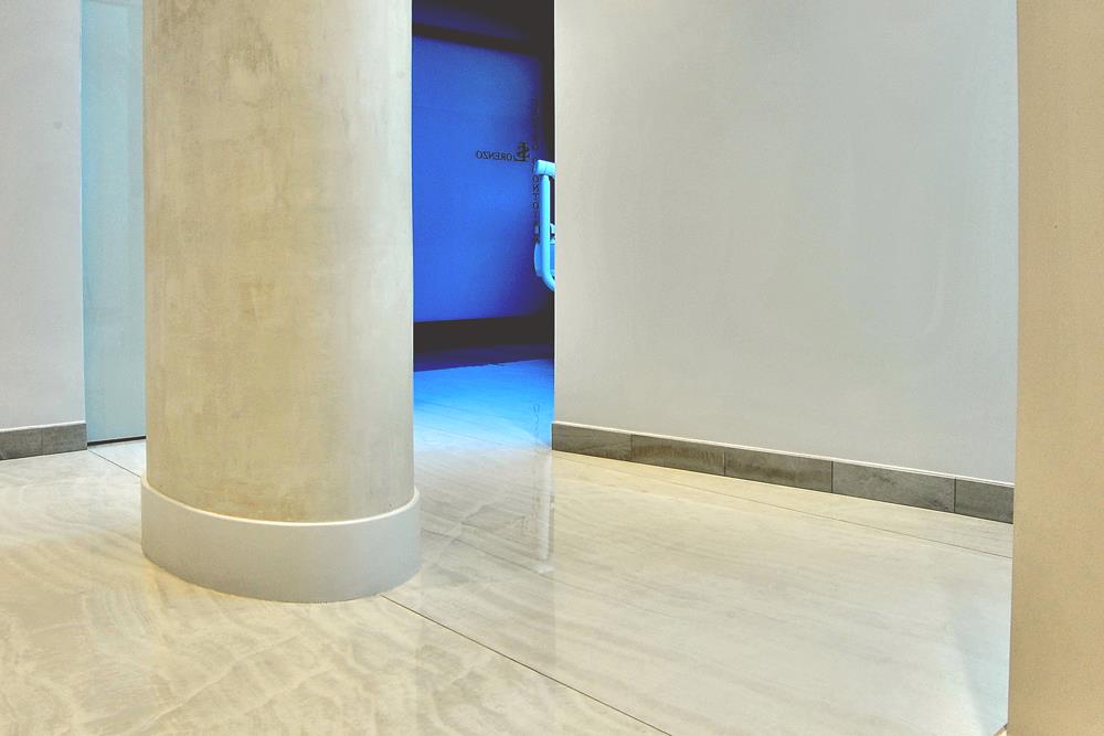 Per gli ambienti interni è stato scelto la collezione ZERO.3 TRILOGY - ONYX LIGHT LUX 100x300 cm a pavimento. Panaria Ceramica conferma la propria missione di azienda leader nel residenziale di qualità presentando Trilogy, un’interpretazione dei marmi classici realizzata con superlativa eccellenza e proposta in modo sontuoso tramite 3 tecnologie combinate in una unica collezione: gres porcellanato, gres laminato “sottile” - soluzione resistente, flessibile, adatta per le ristrutturazioni oltre che facile da tagliare e posare - e monoporosa da rivestimento. Un sistema prodotto imponente, pensato per valorizzare e impreziosire gli ambienti attraverso 5 varianti cromatiche che riprendono alcuni dei principali temi del marmo: Calacatta White, Onyx Light, Moon Beige, Sandy Grey, Sky Smoke.