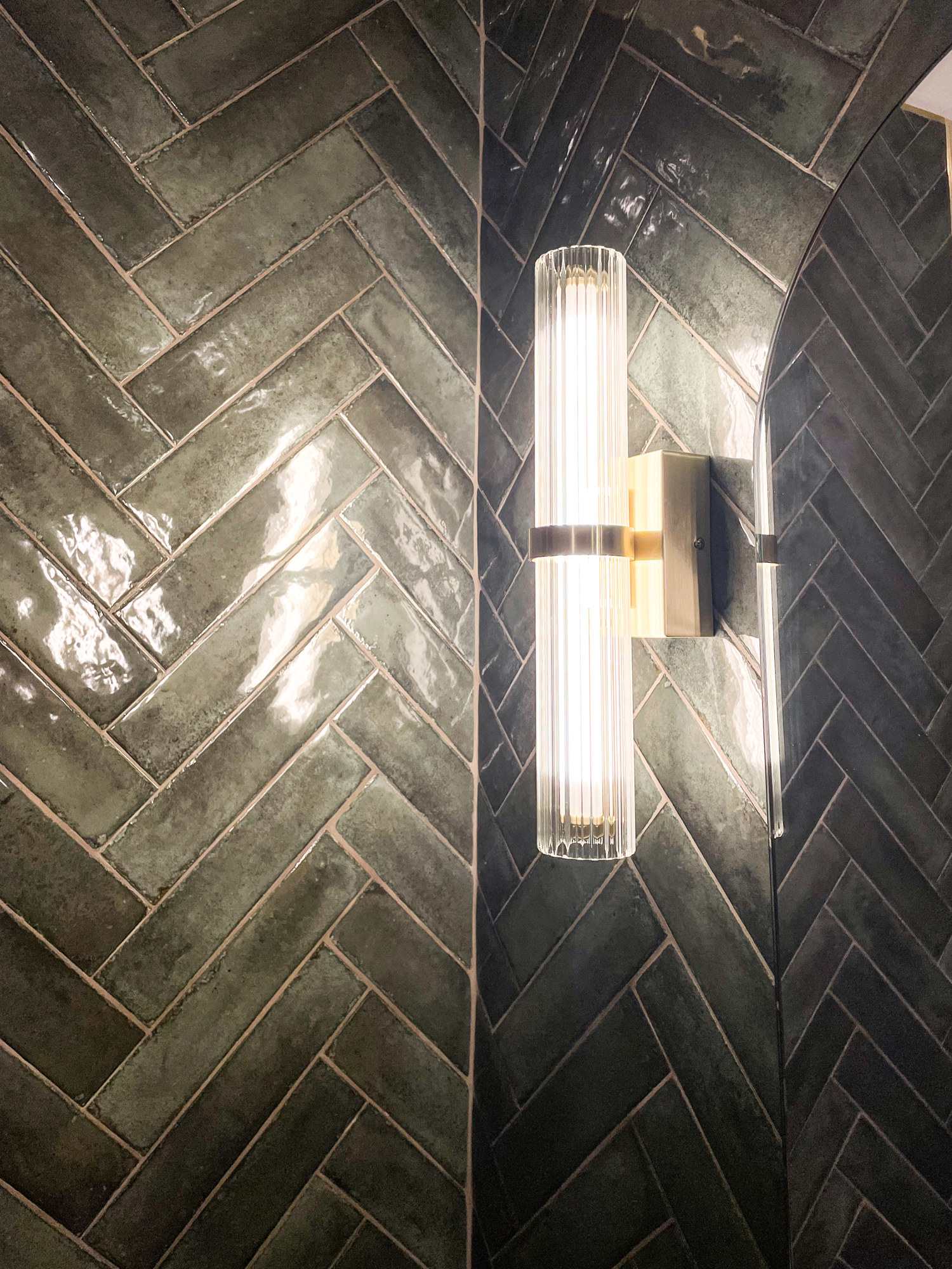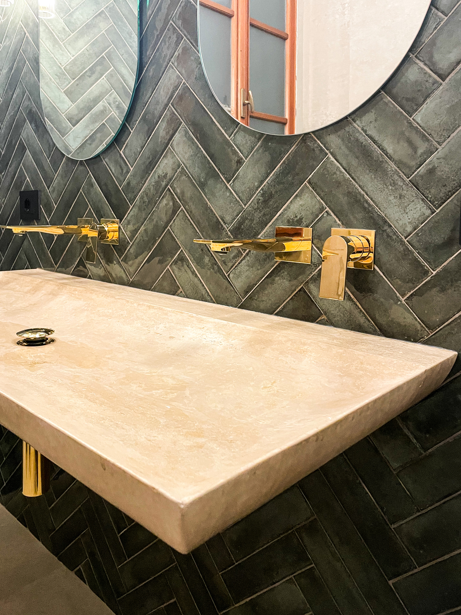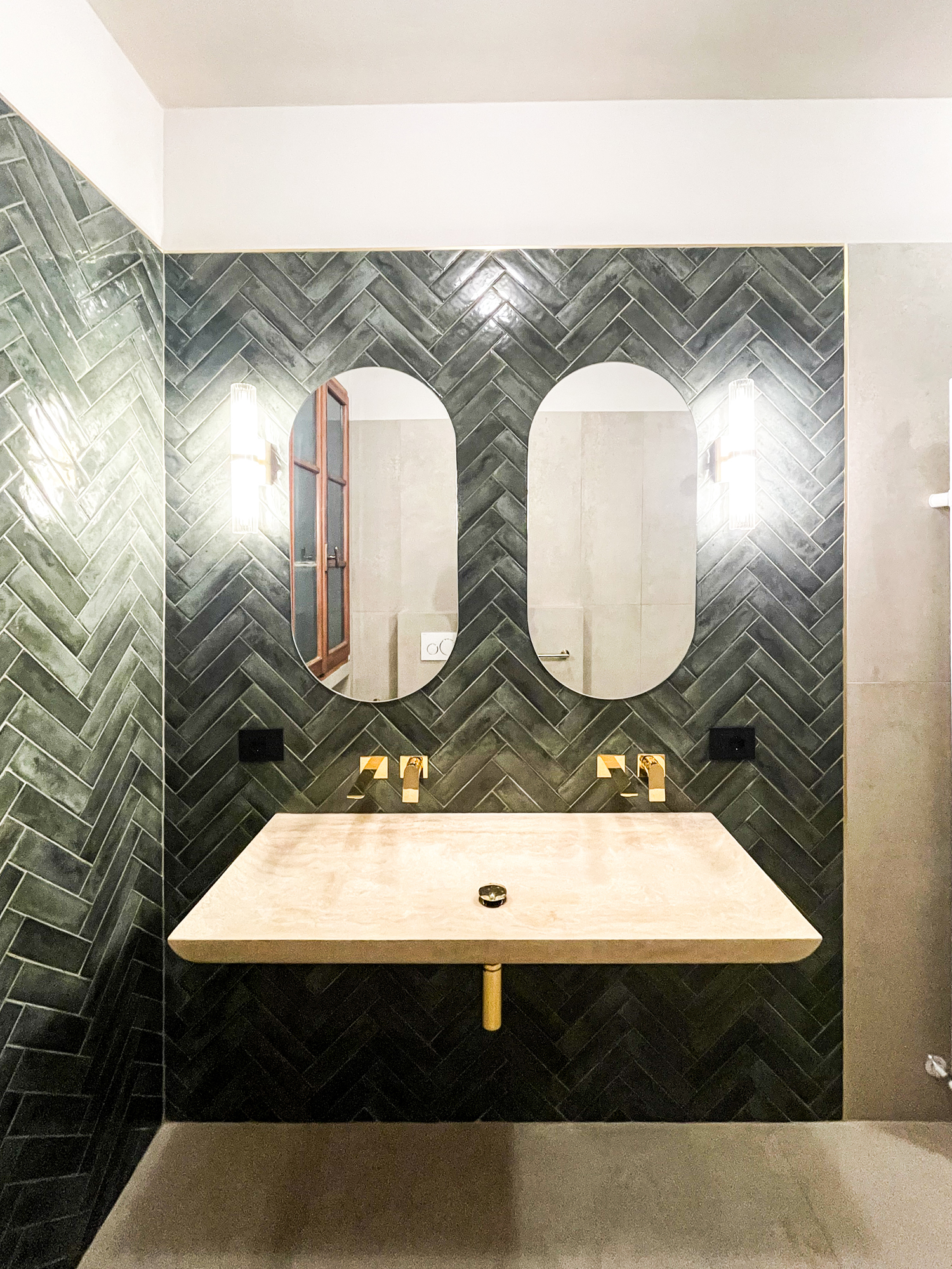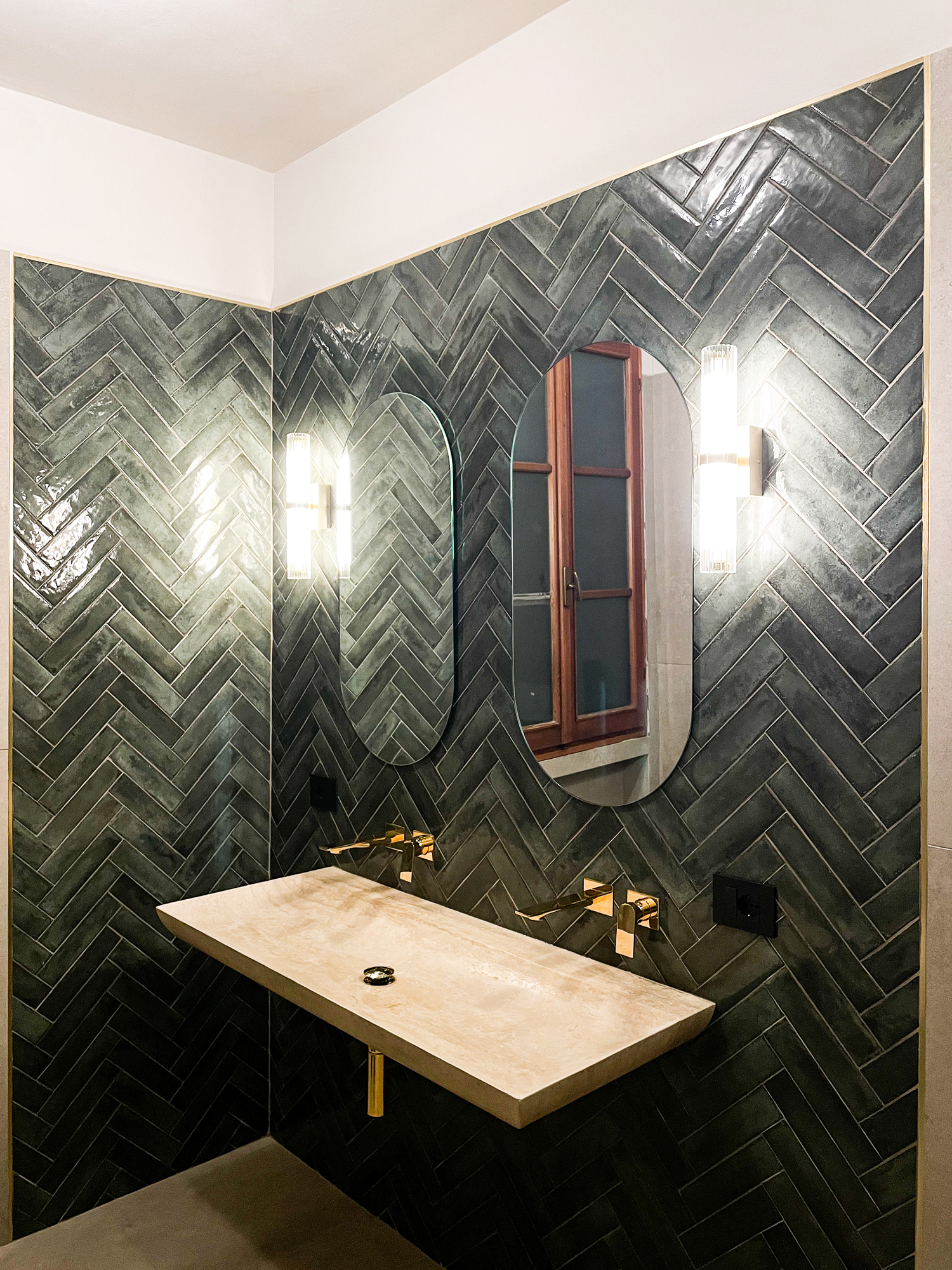 Pour ajouter une touche glamour et sublimer l’élégance de l’espace, le revêtement a été posé en chevrons, créant un mouvement visuel qui dialogue avec la lumière naturelle et amplifie l’effet texturé des surfaces.
